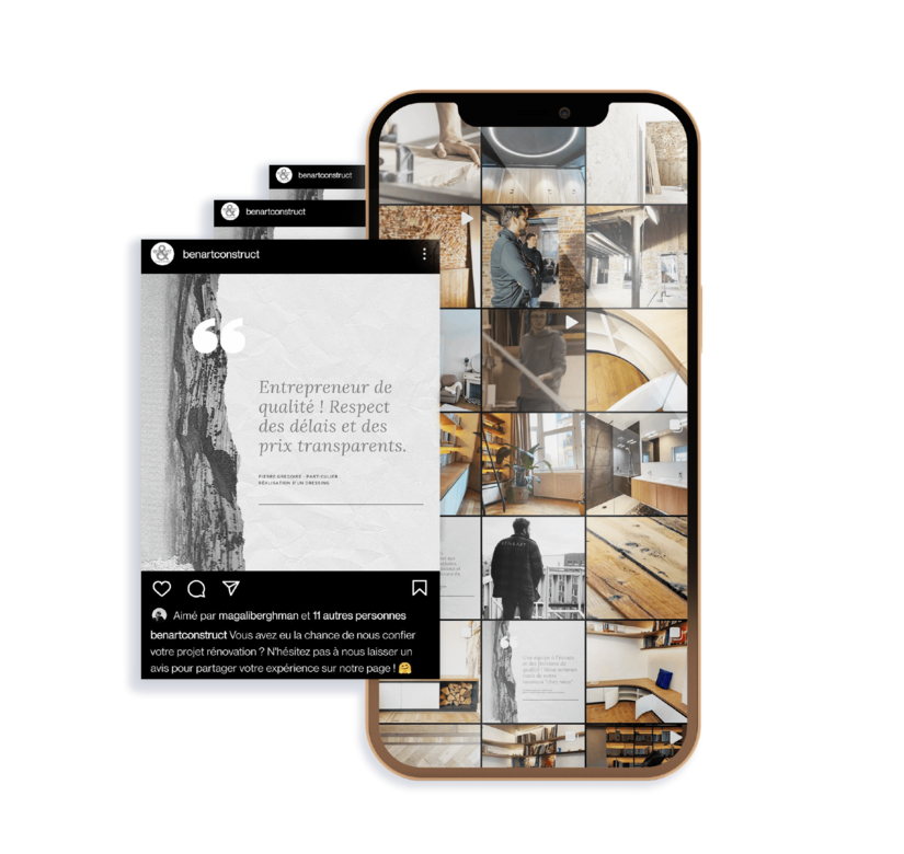 Ben&Art est une entreprise générale de construction spécialisée dans la rénovation et l’aménagement d’espaces. Ils nous ont confié la gestion de leurs réseaux sociaux pour profiter d’une image plus professionnelle mais aussi pour mieux faire ressortir leurs différents métiers, de la conception à la réalisation.